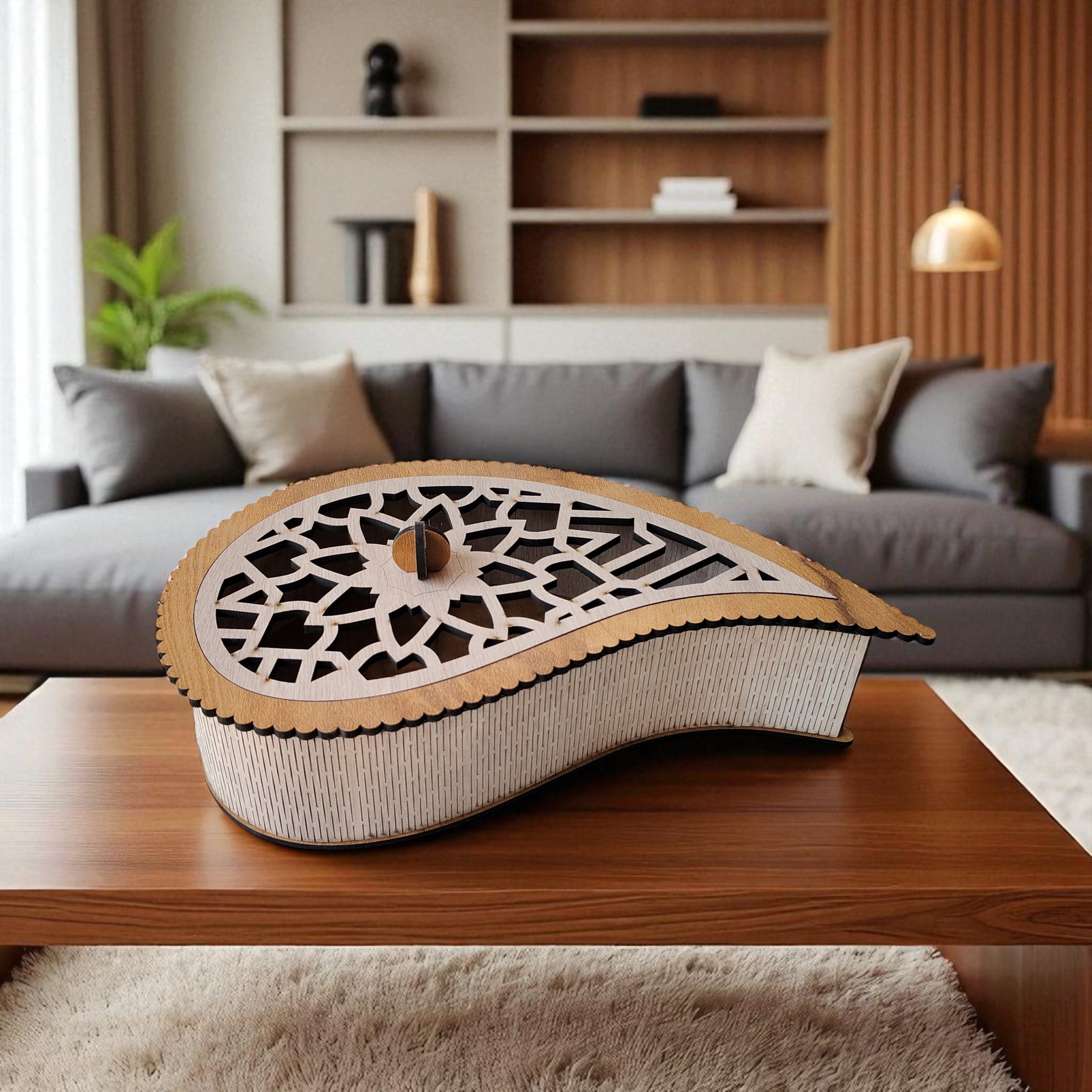 Enhance your dining and gifting experience with this beautifully designed MDF wooden dry fruit box. Crafted with premium quality engineered wood (MDF), this box features a stylish brown and white laser-cut pattern and comes with a secure lid. Perfect for storing dry fruits, chocolates, sweets, or snacks, it also makes an ideal choice for festive gifting, weddings, and home décor. Its elegant design adds a touch of sophistication to your dining table or gift hamper.