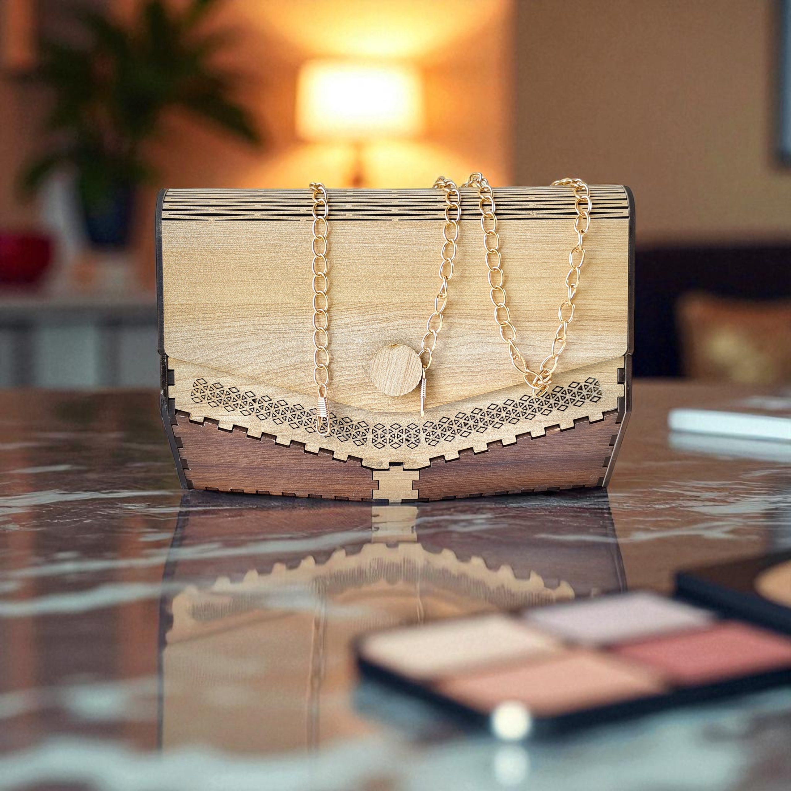 A beautifully crafted wooden purse with floral engraving & golden chain – blending tradition with modern charm. ���� Perfect for those who love to carry art with style