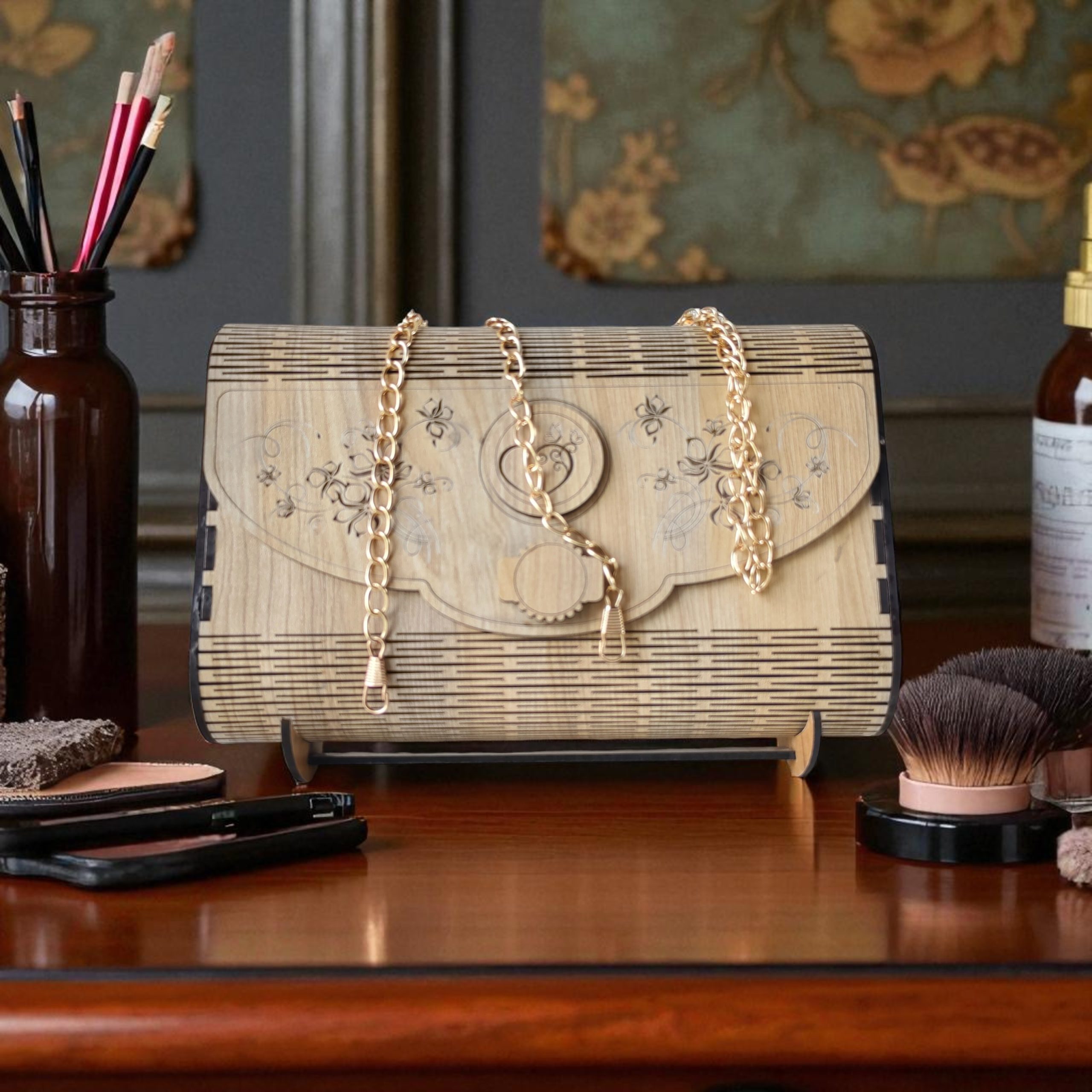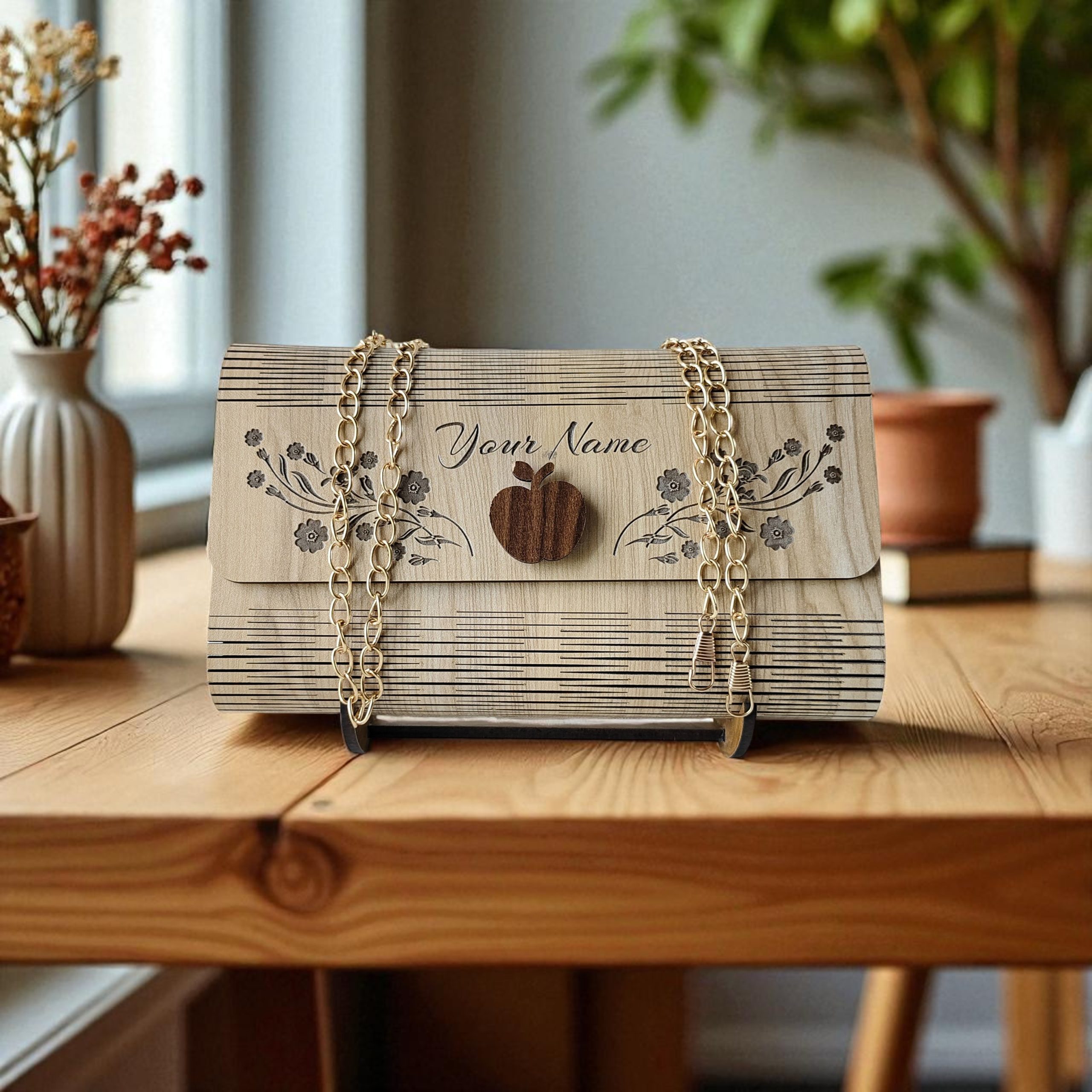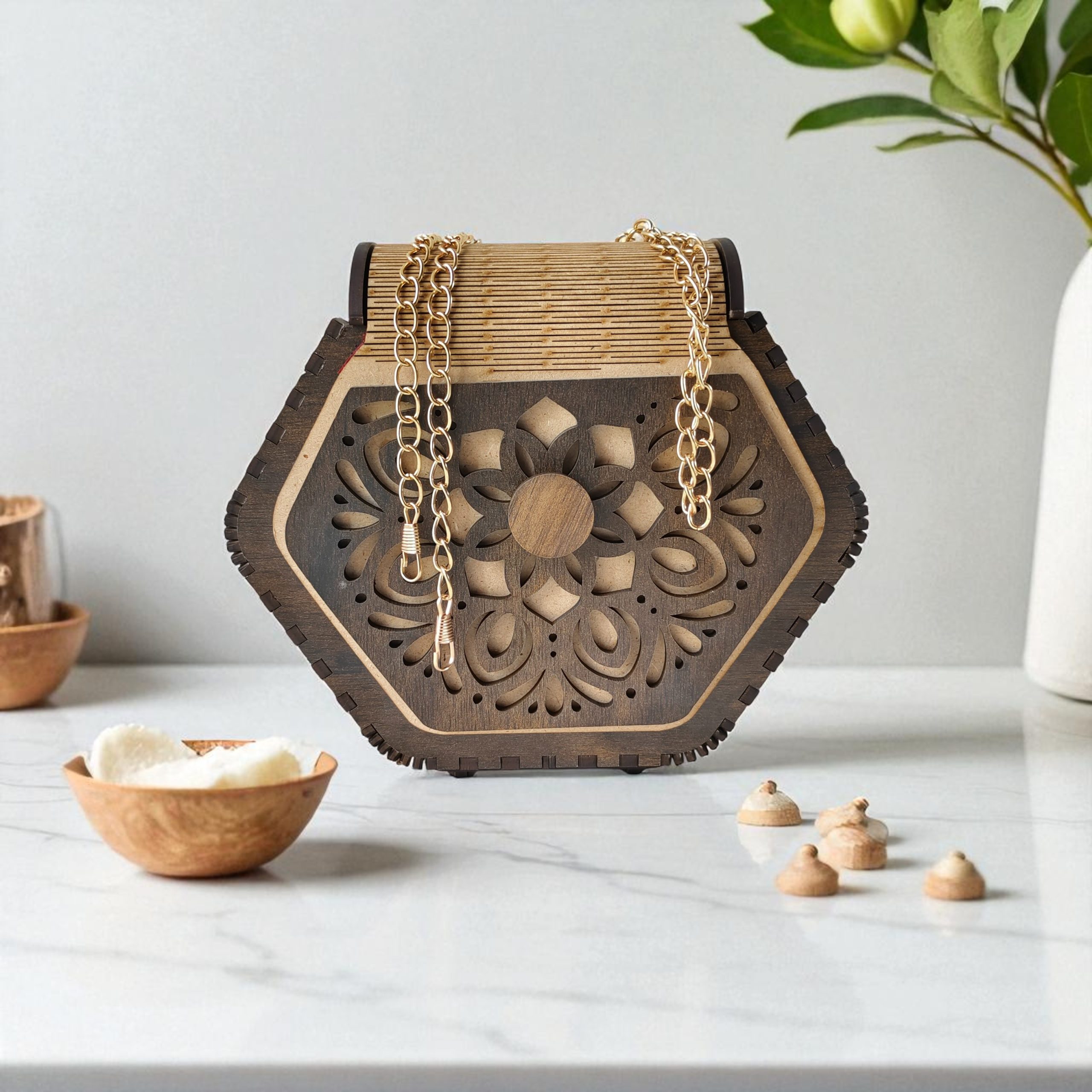 This handcrafted wooden purse with intricate cutwork and golden chain is more than an accessory – it’s a timeless piece of art