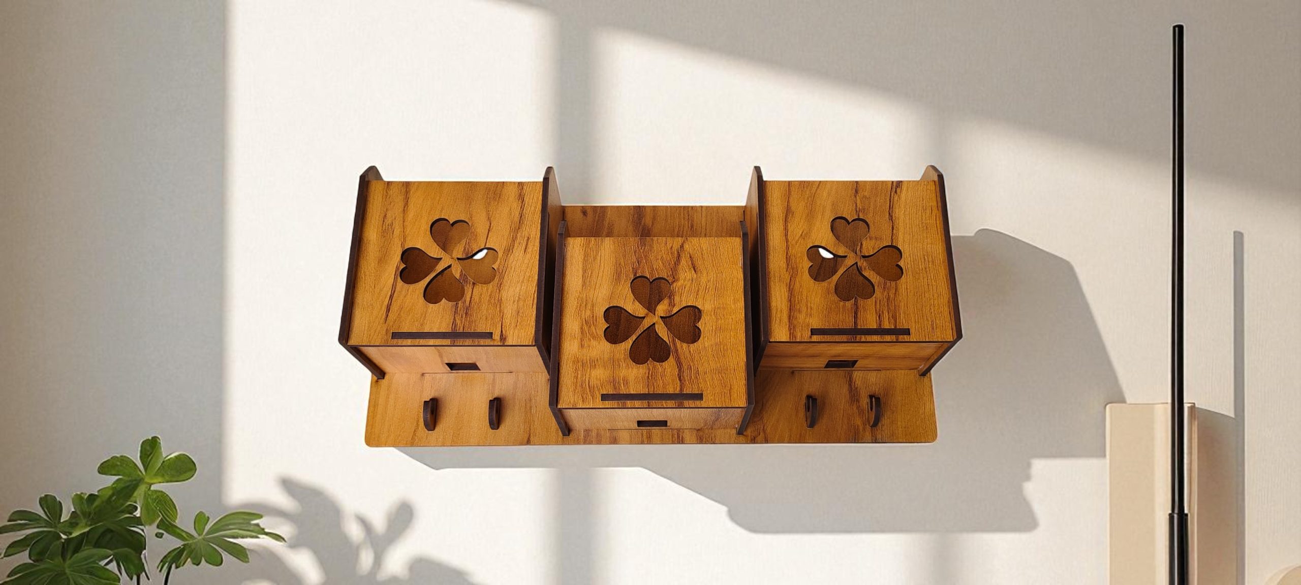 “Wooden Wall-Mounted 3 Phone & Key Holder – Stylish & Functional Organizer.